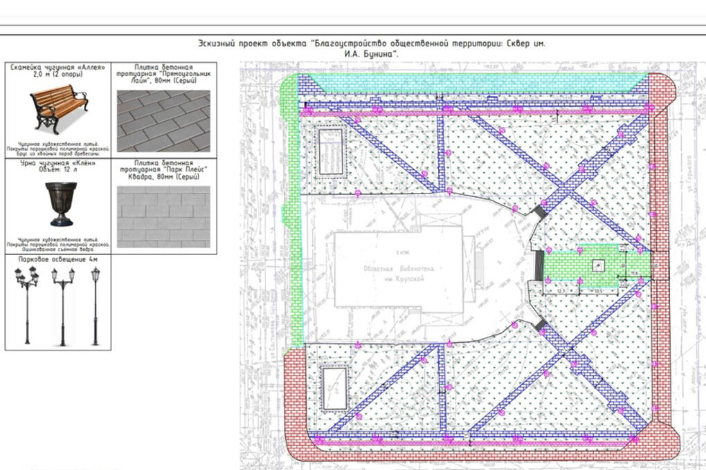 Благоустройство сквера имени И.А. Бунина также будет включать установку аналогичных фонарей и лавочек вдоль тропинок. Стоимость благоустройства сквера имени И.А. Бунина оценивается в 32 миллиона рублей.
