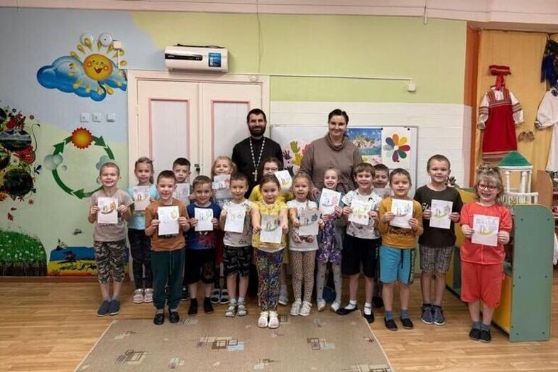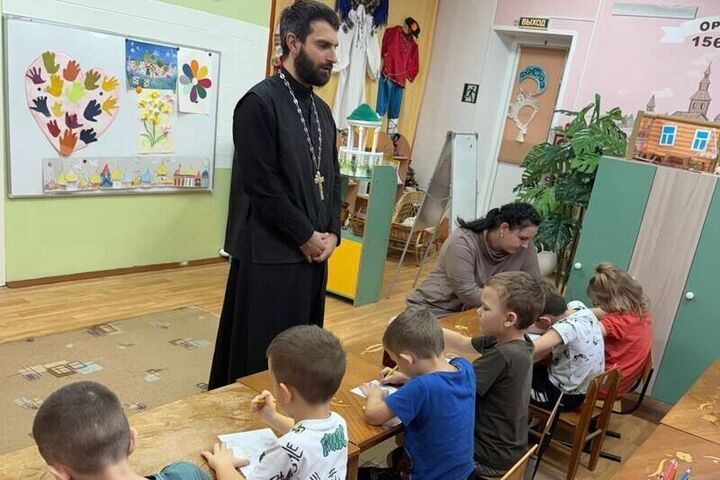 С воспитанниками старших групп детского сада №41 города Орла встретились руководитель сектора дошкольного образования ОРОиК, клирик храма Казанской иконы Божией Матери иерей Максим Кондрашин и педагог Светлана Игнашина.