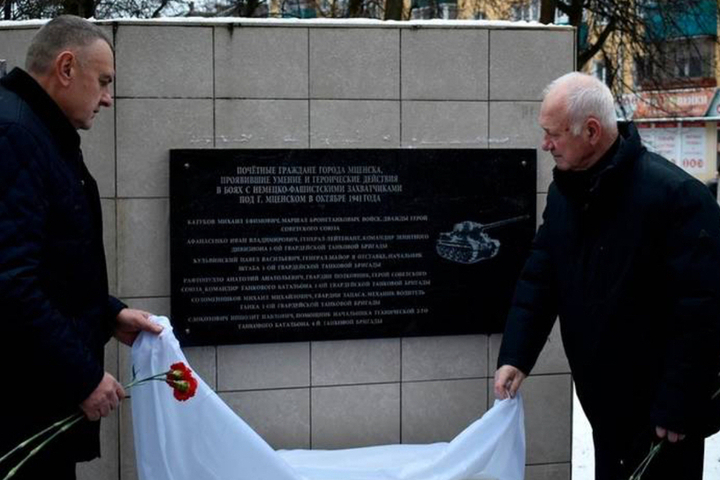 В мценском сквере Танкистов-первогвардейцев появилась мемориальная доска в честь 6 почетных граждан, сражавшихся в составе 4-й танковой бригады в октябре 1941 года. Об этом сообщает пресс-служба администрации города.